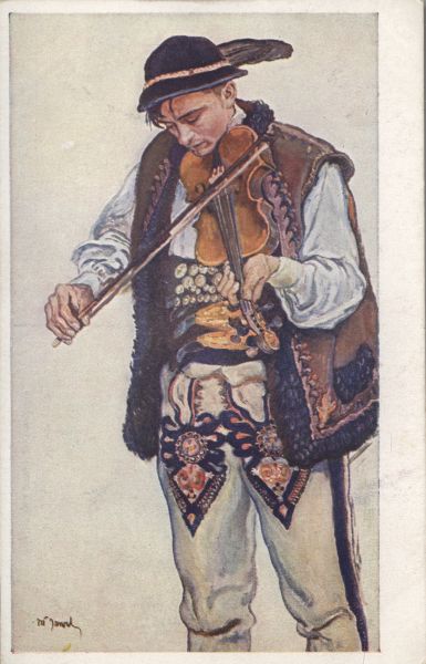 Reprodukcja obrazu W. Jarockiego przedstawiająca górala grającego na skrzypcach.