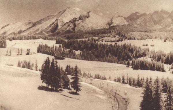 Bukowina Tatrzańska w zimie. Na pierwszym planie droga wjazdowa do wsi. W tle widoczne Tatry Bielskie i grupa Łomnicy.