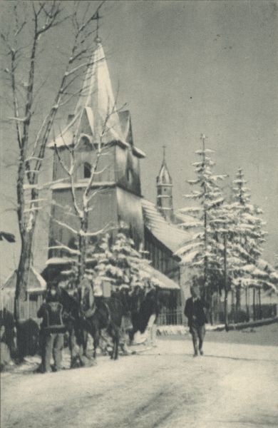Kościół w Bukowinie Tatrzańskiej. Przy drodze stoją sanie.