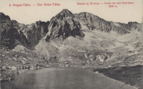 Wielki Staw Spiski w Dolinie Pięciu Stawów Spiskich. Nad nim Lodowy Szczyt. U góry drukowany tytuł, również w języku niemieckim.