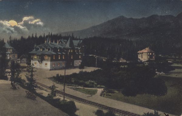 Szczyrbskie Jezioro w nocy. Widoczny budynek hotelu Solisko i willi Marina. W tle Krywań. Na pierwszym planie widoczne tory kolei elektrycznej.