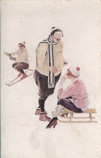 Sceny z wyścigów narciarskich w Zakopanem malował M. Duda.