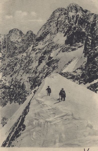 Taternicy na grani Czarnego Szczytu w zimie. W tle Łomnica.