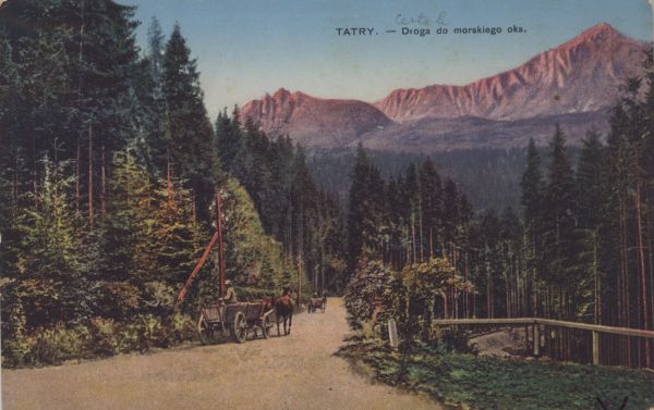 Wozy na drodze do Morskiego Oka. U góry drukowany tytuł.