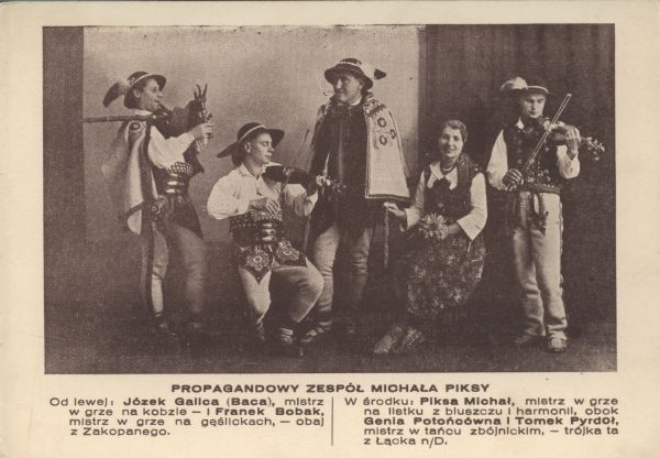 PROPAGANDOY ZESPÓŁ MICHAŁA PIKSY. Od lewej Józek Galica (Baca), mistrz na kobzie - i Franek Bobak, mistrz w grze na gęślickach, - obaj z Zakopanego. W środku: Piksa Michał, mistrz w grze na listku z bluszczu i harmonii, obok Genia Potońcówna i Tomek Pyrdoł, mistrz w tańcu zbójnickim, - trójka ta z Łącka n/D.