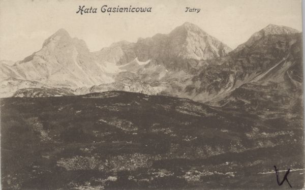 Hala Gąsienicowa. Widok na Kościelec i Świnicę. U góry wydrukowany tytuł.