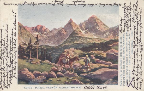 Reprodukcja obrazu Walerego Eljasza Radzikowskiego pt. Tatry: Dolina Stawów G±sienicowych. Pod reprodukcj± drukowany tytuł, na marginesie wiersz A. Asnyka. Korespondencja.
