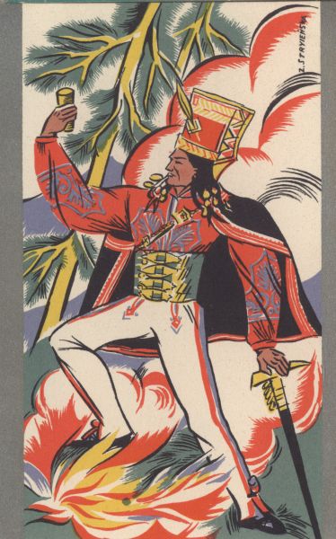 Reprodukcja rysunku Zofii Stryjeńskiej przedstawiającego harnasia.