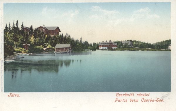 Hotel Hviezdoslav i sanatorium dziecięce Solisko nad Szczyrbskim Jeziorem. Nad brzegiem widoczna przystań. Pod zdjęciem wydrukowany tytuł, na marginesie po lewej stronie wydawca.