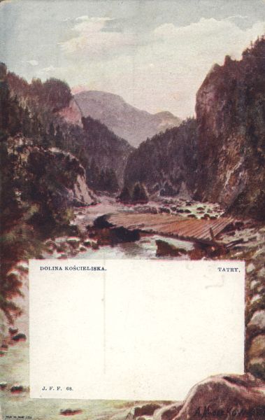 Reprodukcja obrazu Aleksandra Mroczkowskiego Dolina Kościeliska. W okienku u dołu wydrukowany tytuł, na dole inicjały wydawcy.