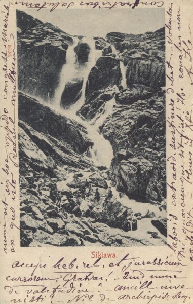 Wodospad Siklawa w Dolinie Roztoki. Na kamieniach pod nim siedzą turyści. Pod zdjęciem wydrukowany tytuł. Na marginesach korespondencja.