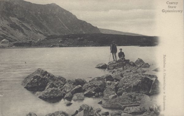 Czarny Staw G±sienicowy. Nad brzegiem odpoczywa turysta z przewodnikiem. Na marginesie wydrukowany tytuł i nakładca.