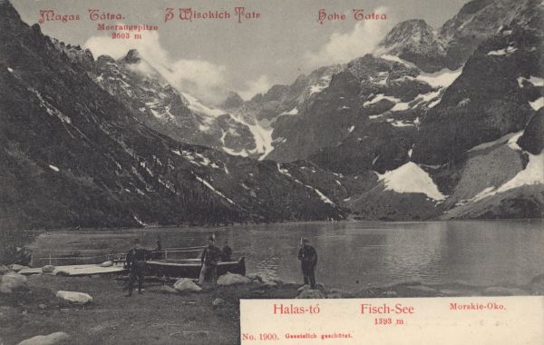 Morskie Oko w Dolinie Rybiego Potoku. Nad brzegiem jeziora przy przystani stoją turyści, przewodnicy i żandarm. W tle Rysy. U góry, a także w okienku na dole po prawej stronie wydrukowany tytuł, także w języku niemieckim i polskim.