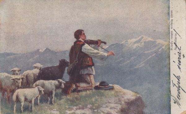 Reprodukcja obrazu Adama Setkowicza przedstawiającego pasterza grającego o poranku na hali.