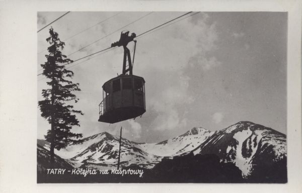 Wagonik kolei linowej w drodze na Kasprowy Wierch. W tle Goryczkowa Czuba. U dołu wpisany tytuł.