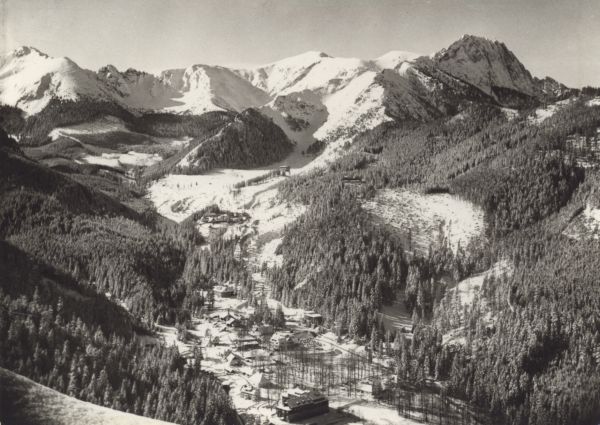 Widok z Nosala na Kuźnice i Kalatówki zimą. W tle od lewej Goryczkowa Czuba, Kondracka Kopa i Giewont.
