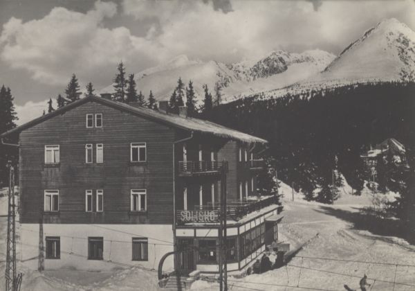 Wysokie Tatry - Szczyrbskie Jezioro. Sanatorium dziecięce Solisko. W tle Krywań, Siodełkowa Kopa, Ostra, Solisko.