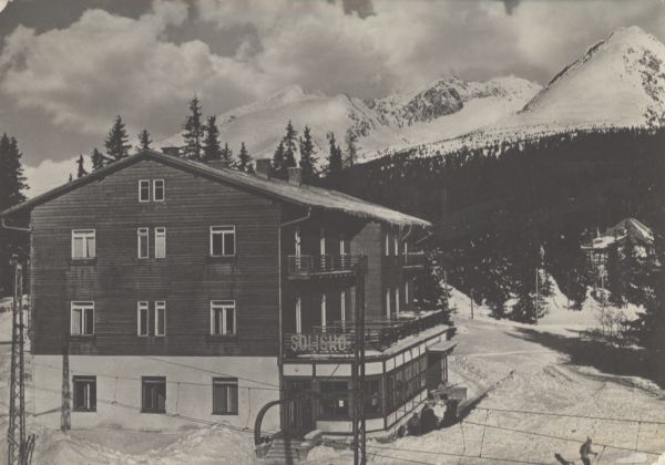 Wysokie Tatry - Szczyrbskie Jezioro. Sanatorium dziecięce Solisko. W tle Krywań, Siodełkowa Kopa, Ostra, Solisko.