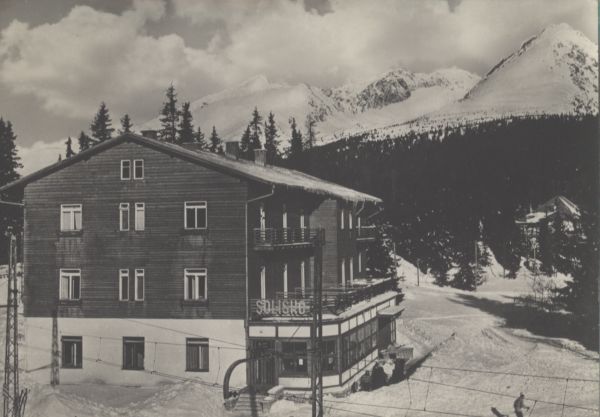 Sanatorium dziecięce Solisko w Szczyrbskim Jeziorze w zimowej scenerii. Na pierwszym planie trakcja elektryczna kolei. Z prawej w tle willa Marina. W tle Krywań, Siodełkowa Kopa, Ostra i Solisko.