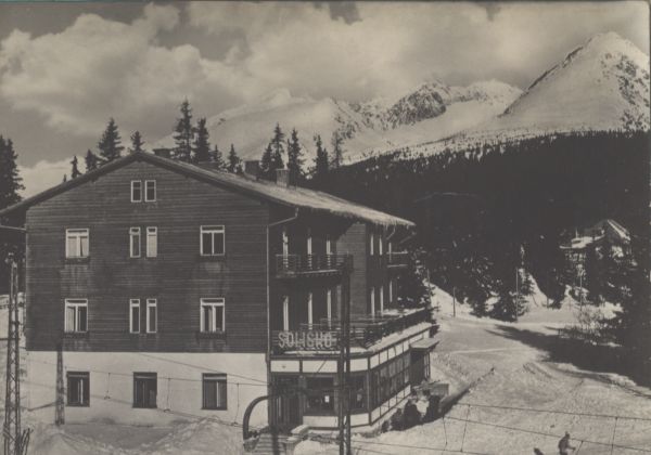 Wysokie Tatry - Szczyrbskie Jezioro. Sanatorium dziecięce Solisko. W tle Krywań, Siodełkowa Kopa, Ostra, Solisko.