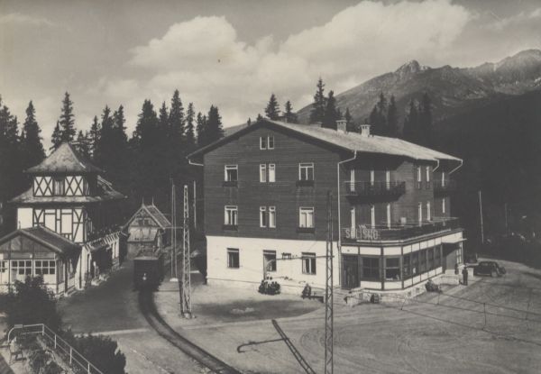 Sanatorium dziecięce Solisko i dworzec kolei elektrycznej w Szczyrbskim Jeziorze. W tle Krywań.