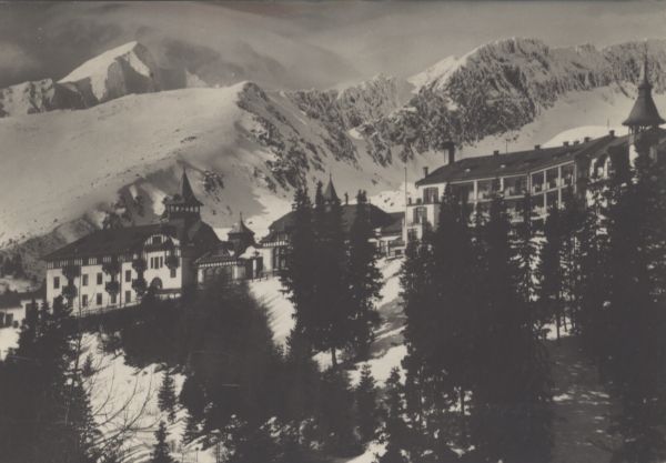 Zimowy widok na zabudowania hotelowe w miejscowości Szczyrbskie Jezioro. W tle od lewej widać Krywań, Siodełkową Kopę i grań Ostrej.