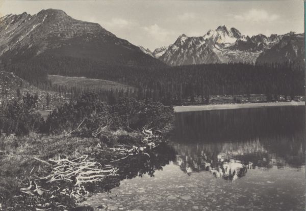 Na pierwszym planie Szczyrbskie Jezioro. W tle od lewej widać Skrajną Basztę, Kopę Popradzką i Wysoką.