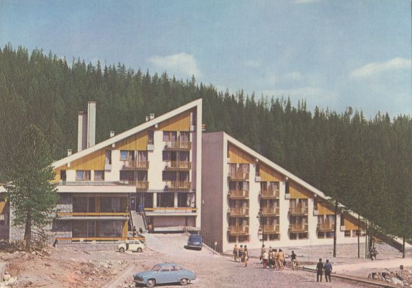 Budynek hotelu FIS w Szczyrbskim Jeziorze. Na pierwszym planie grupa ludzi.
