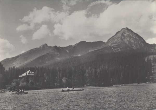 Na pierwszym planie tafla Szczyrbskiego Jeziora, a na niej dwie łodzie wypełnione turystami. W tle pejzaż Tatr Wysokich: Krywań, Ostra i Solisko.