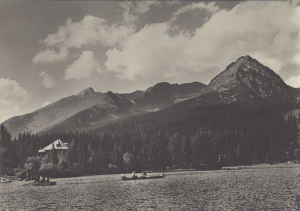 Na pierwszym planie tafla Szczyrbskiego Jeziora, a na niej dwie łodzie wypełnione turystami. W tle pejzaż Tatr Wysokich: Krywań, Ostra i Solisko.
