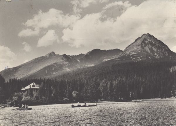 Na pierwszym planie tafla Szczyrbskiego Jeziora, a na niej dwie łodzie wypełnione turystami. W tle pejzaż Tatr Wysokich: Krywań, Ostra i Solisko.