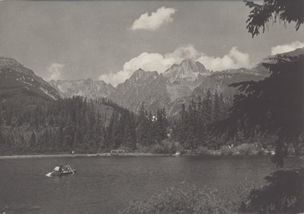 Łódź na Nowym Szczyrbskim Jeziorze. W tle Wołowy Grzbiet, Popradzka Kopa i Wysoka.