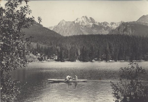 Widok znad Szczyrbskiego Jeziora na grupę Wysokiej. Z lewej Popradzka Kopa, z prawej Ganek, Rumanowy Szczyt, Żłobisty Szczyt.