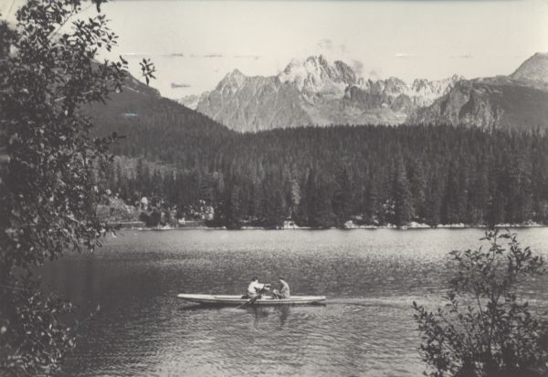 Widok znad Szczyrbskiego Jeziora na grupę Wysokiej. Z lewej Popradzka Kopa, z prawej Ganek, Rumanowy Szczyt, Żłobisty Szczyt.