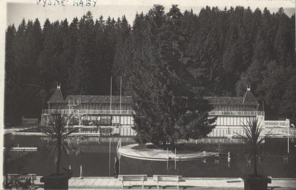 Kąpielisko Drużbaki Wyżne. W tle las. U góry odręczny napis: Vyšné Hágy.