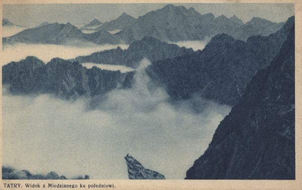Widok z Miedzianego na południe. W dole morze chmur. Pod zdjęciem drukowany tytuł.
