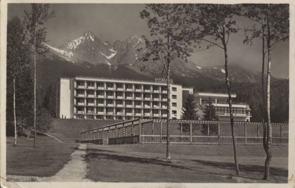 Hotel Morawa wraz z otoczeniem w Tatrzańskiej Łomnicy. W tle Łomnica i Kieżmarski Szczyt.