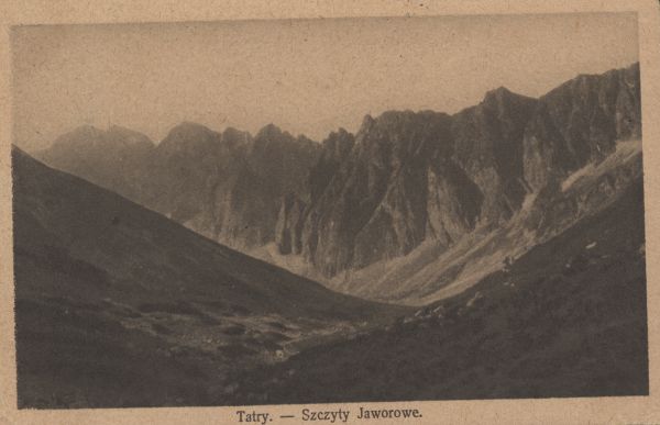 Widok na Jaworowe Szczyty z Doliny Jaworowej. Od lewej Mały Jaworowy Szczyt, Jaworowy Szczyt i Jaworowe Turnie. Pod zdjęciem drukowany tytuł.