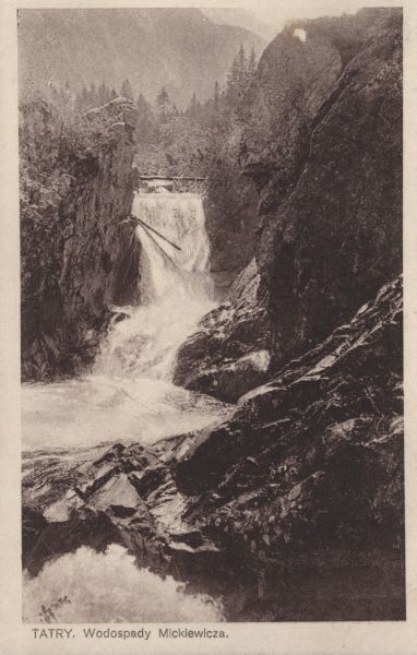 Wodogrzmoty Mickiewicza w Dolinie Roztoki. Pod zdjęciem drukowany tytuł.