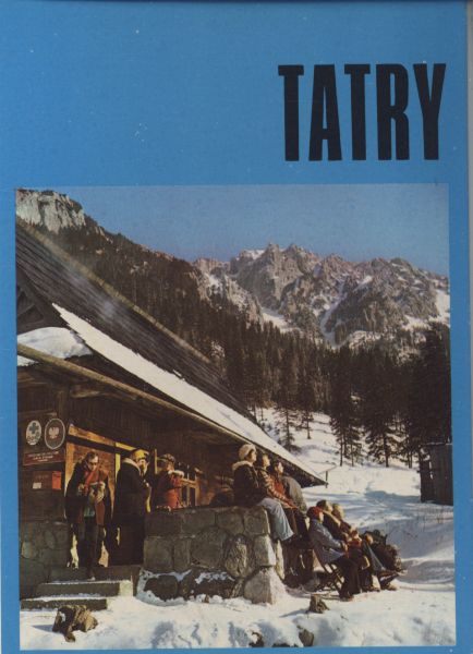 Turyści przed gospodą turystyczną na Hali Pisanej w zimie. U góry napis: TATRY.