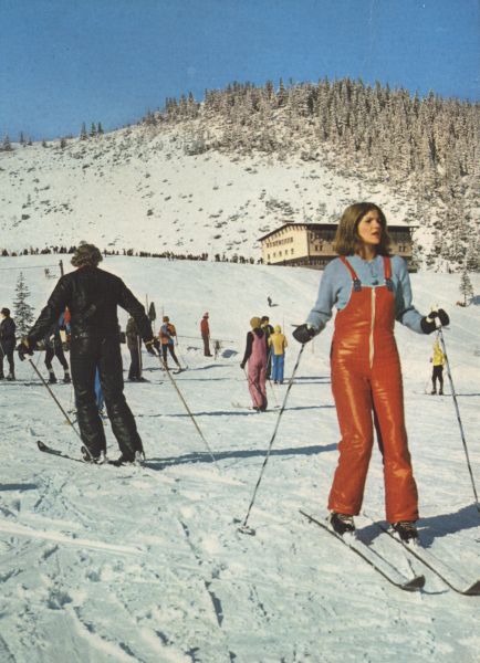 Narciarze na Polanie Kalatówki zimą. W tle schronisko PTTK.