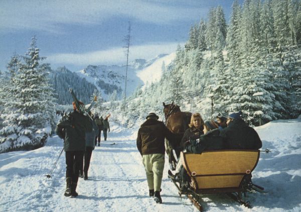 Droga na Kalatówki zimą. Widoczni narciarze oraz sanie wiozące turystów na polanę.
