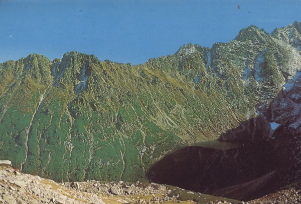 TATRY WYSOKIE Kocioł Czarnego Stawu (1580 m), Żabie Szczyty (2259 m) i Rysy (2499 m) - widok z Hali za Mnichem.