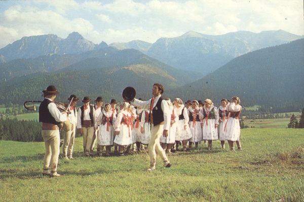 Regionalny Zespół Pieśni i Tańca ROMANKA tańczący na tle Giewontu.