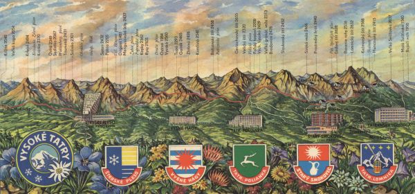 Mapa plastyczna Tatr Wysokich od południa z opisanymi nazwami szczytów i ich wysokością. Zaznaczono i opisano także ważniejsze miasta na Podtatrzu. Na pierwszym planie wśród charakterystycznych gatunków kwiatów rosnących w Tatrach umieszczono herby 5 miejscowości i logo miasta VYSOKÉ TATRY.