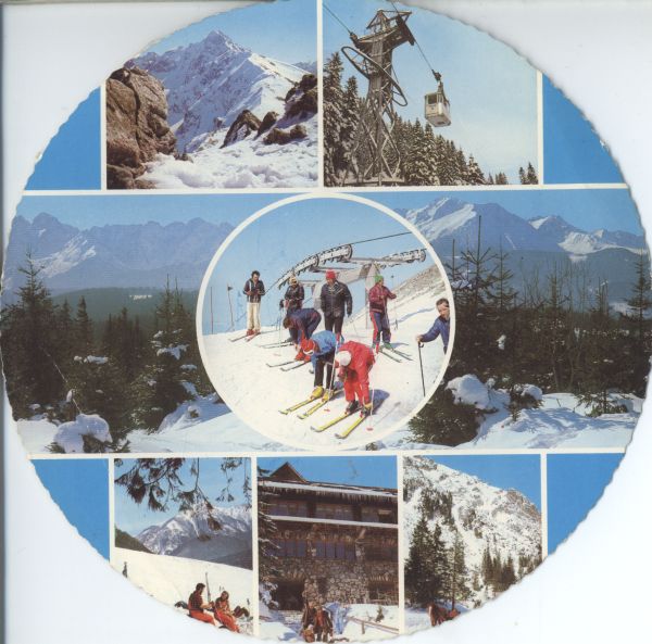 Pocztówka 7. elementowa: Widok na Świnicę z Kasprowego Wierchu zimą. Wagonik kolei linowej na Kasprowy Wierch. Panorama Tatr. Narciarze na szczycie Kasprowego Wierchu. Turyści na Polanie Chochołowskiej. Schronisko PTTK na Polanie Chochołowskiej. Droga do Morskiego Oka zimą.