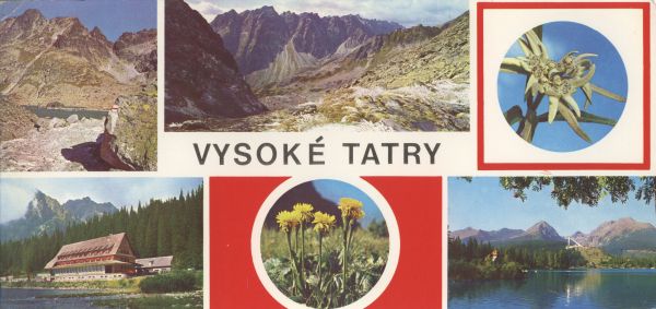 Tatry Wysokie. Widok ze szlaku na Rysy na Wołow± Turnię, Żabi± Turnię i Żabi Koń, pod nimi Wyżni Żabi Staw Mięguszowiecki. Widok na Grań Baszt z Szatanem z przełeczy Waga. Szarotka alpejska. Panorama od Szczyrbskiego Jeziora, (z lewej) Krywań, grań Ostrej, Solisko, Szczyrbski Szczyt i Skrajna Baszta z Grani± Baszt. Prosienicznik jednogłówkowy. Hotel górski im. kpt. Morávku nad Popradzkim Stawem.