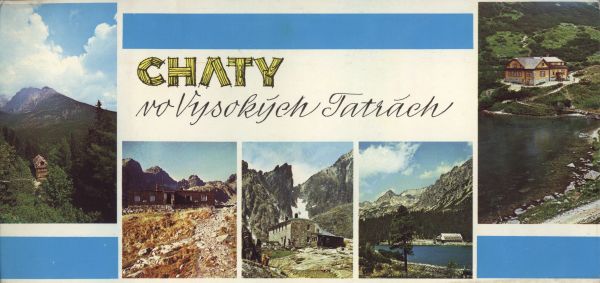 Pocztówka 5. elementowa: Schronisko Bilika pod Siodełkiem. Schronisko Zbójnickie w Dolinie Staroleśnej. Schronisko Téryego w Dolinie Pięciu Stawów Spiskich. Hotel górski nad Popradzkim Stawem. Schronisko nad Zielonym Stawem Kieżmarskim. Napis: Chaty vo Vysokých Tatrách.