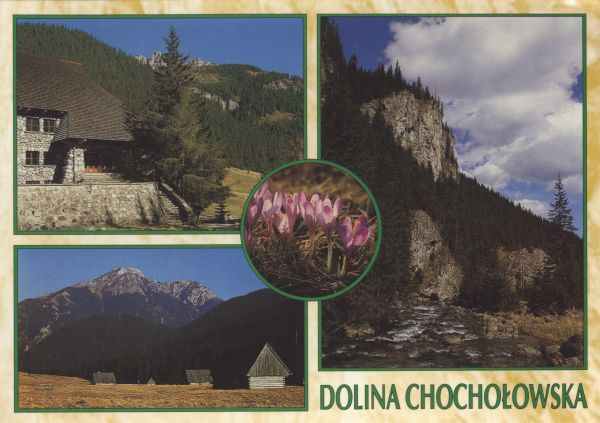 Pocztówka 4. elementowa: Schronisko na Polanie Chochołowskiej. Szałasy na Polanie Chochołowskiej, w tle Kominiarski Wierch. Chochołowski Potok. Krokusy (crocus scepusiensis). Napis: Dolina Chochołowska.