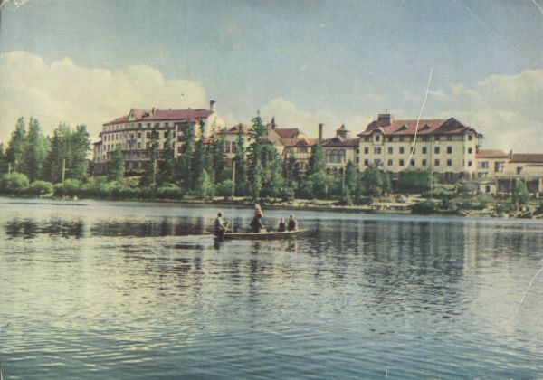 ŁódĽ z turystami na Szczyrbskim Jeziorze. W tle hotele Krywań i Hviezdoslav.